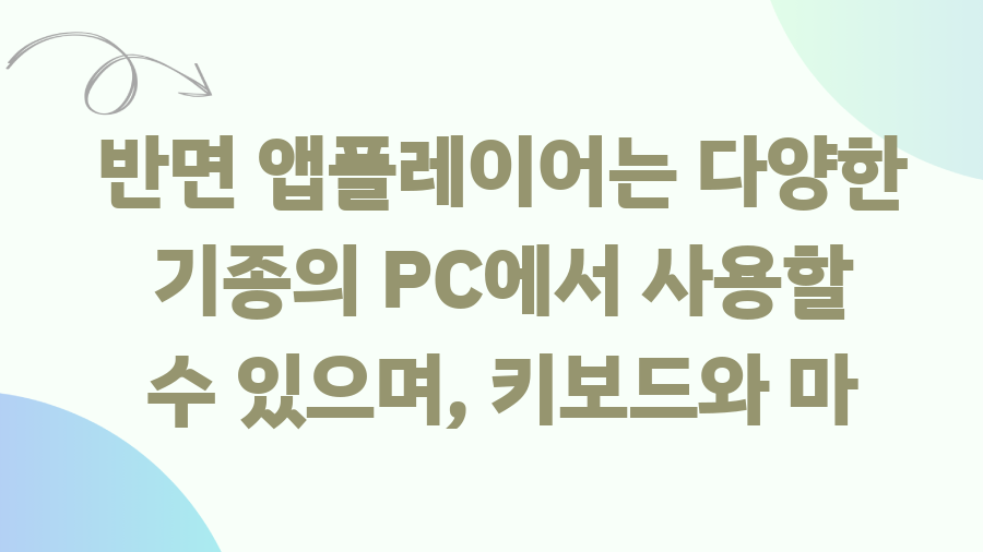반면 앱플레이어는 다양한 기종의 PC에서 사용할 수 있으며, 키보드와 마우스 커스텀 키 설정 등 다양한 편의 기능을 제공하지만, 공식 지원이 아니므로 예상치 못한 문제가 발생할 수 있습니다.